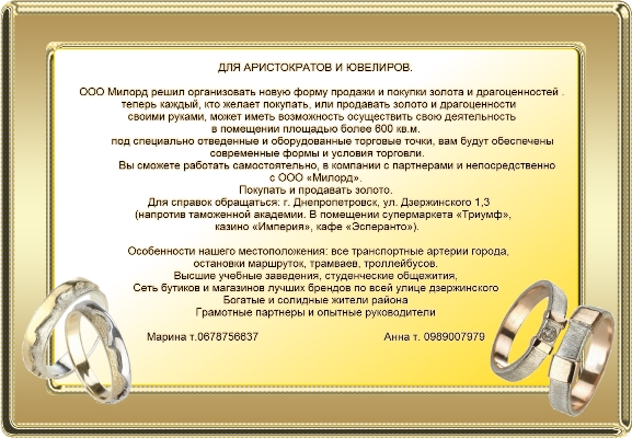 ООО Милорд решил организовать новую форму продажи и покупки золота и драгоценностей . Теперь каждый, кто желает покупать, или продавать золото и драгоценности Своими руками, может иметь возможность осуществить свою деятельность в помещении площадью более 600 кв.м. Под специально отведенные и оборудованные торговые точки, Вам будут обеспечены современные формы и условия торговли. Вы сможете работать самостоятельно, в компании с партнерами и непосредственно с ООО «Милорд». Покупать и продавать золото. Для справок обращаться: г. Днепропетровск, ул. Дзержинского 1,3 (Ориентиры: напротив Таможенной академии. В помещении супермаркета «Триумф», казино «Империя», кафе «Эсперанто»).