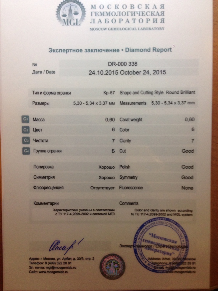 Хар-ки : 6/7 (Московская геммологическая лаборатория)
