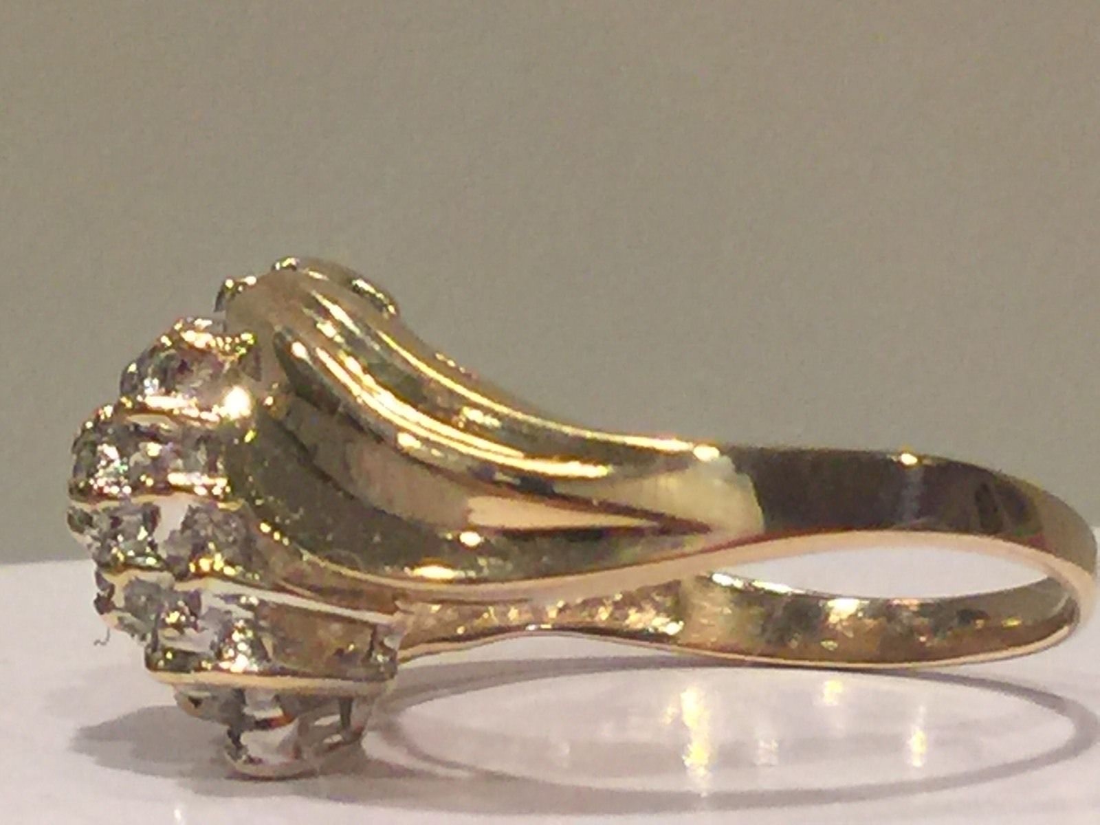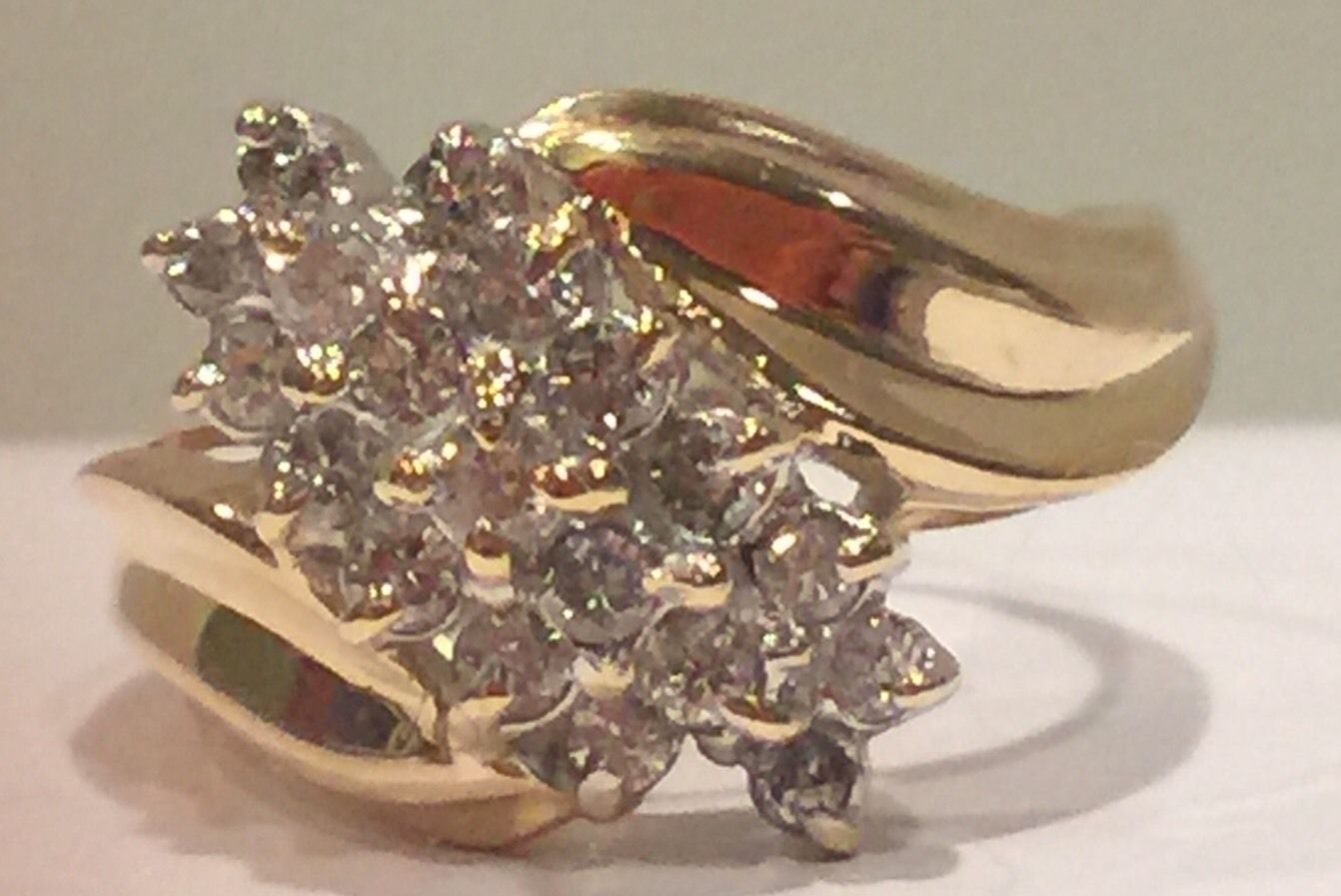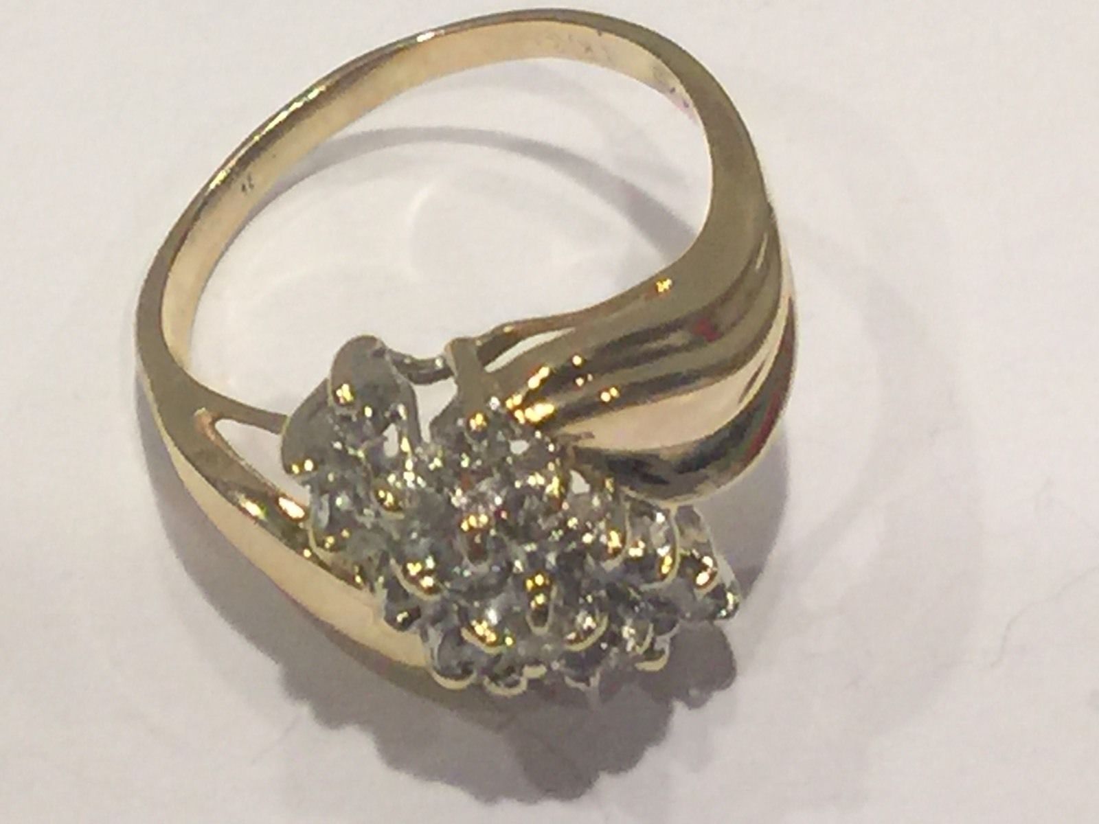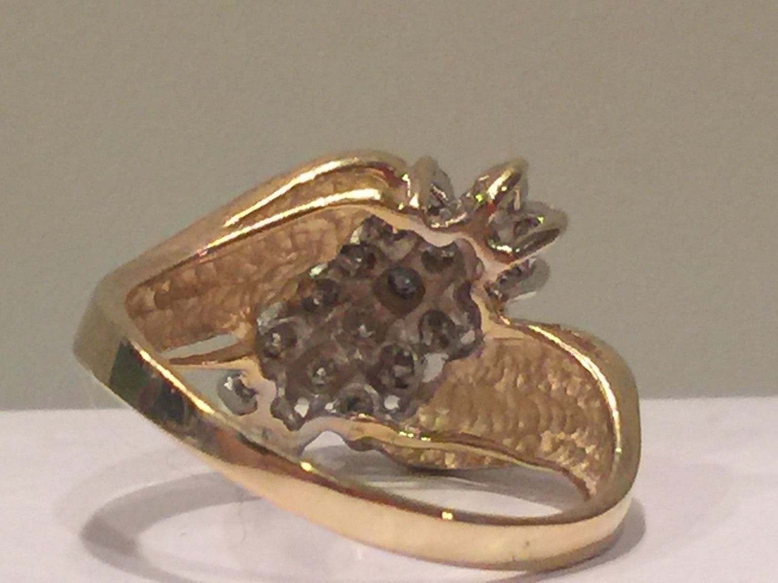 Продам золотое кольцо 585 проба с 19 бриллиантами размер 1,8-2,2 мм, общий вес 0.75 карат. Общий вес кольца 5,2 грамма. Размер кольца 18.